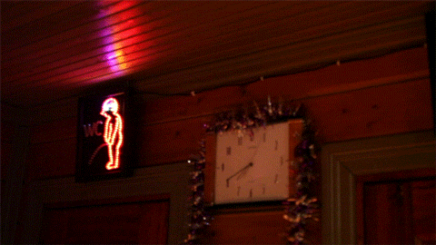 Ronin takana on miestenvessa. Oven yläpuolella välkkyy valotaulu, jonka valopisteet muodostat virtsaavan hahmon. Kusivana ilmestyy tauluun yksi valo kerrallaan plop, plop, plop.